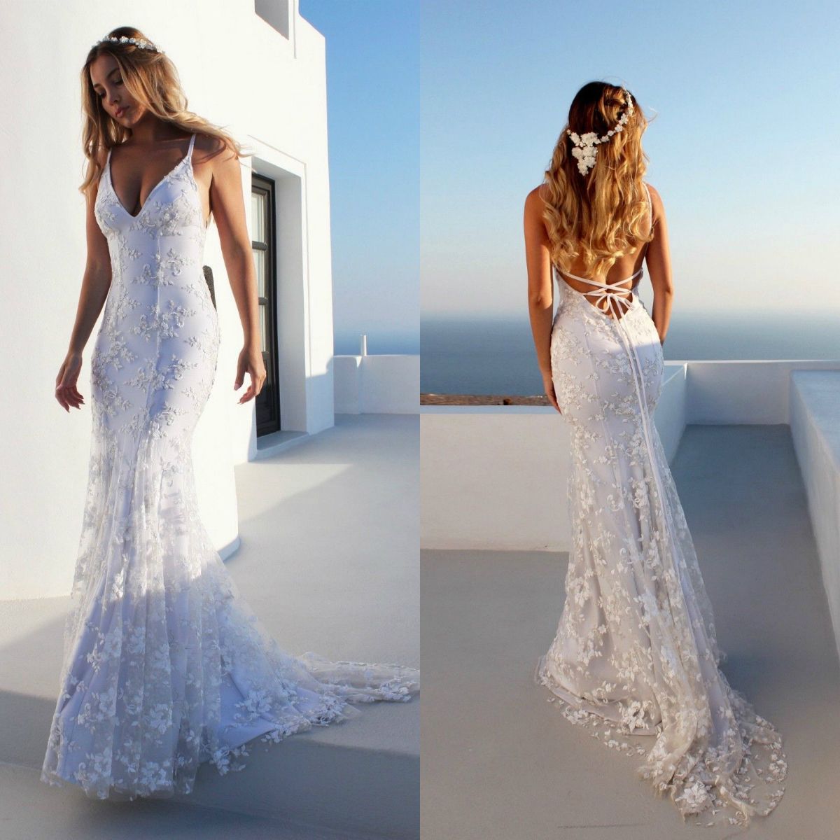 2019 Mermaid Beach Wedding Dresses Lace Appliqued Backless Bridal Gowns V Neck Country Hot Sale Abiti Da Sposa by dhgate.com