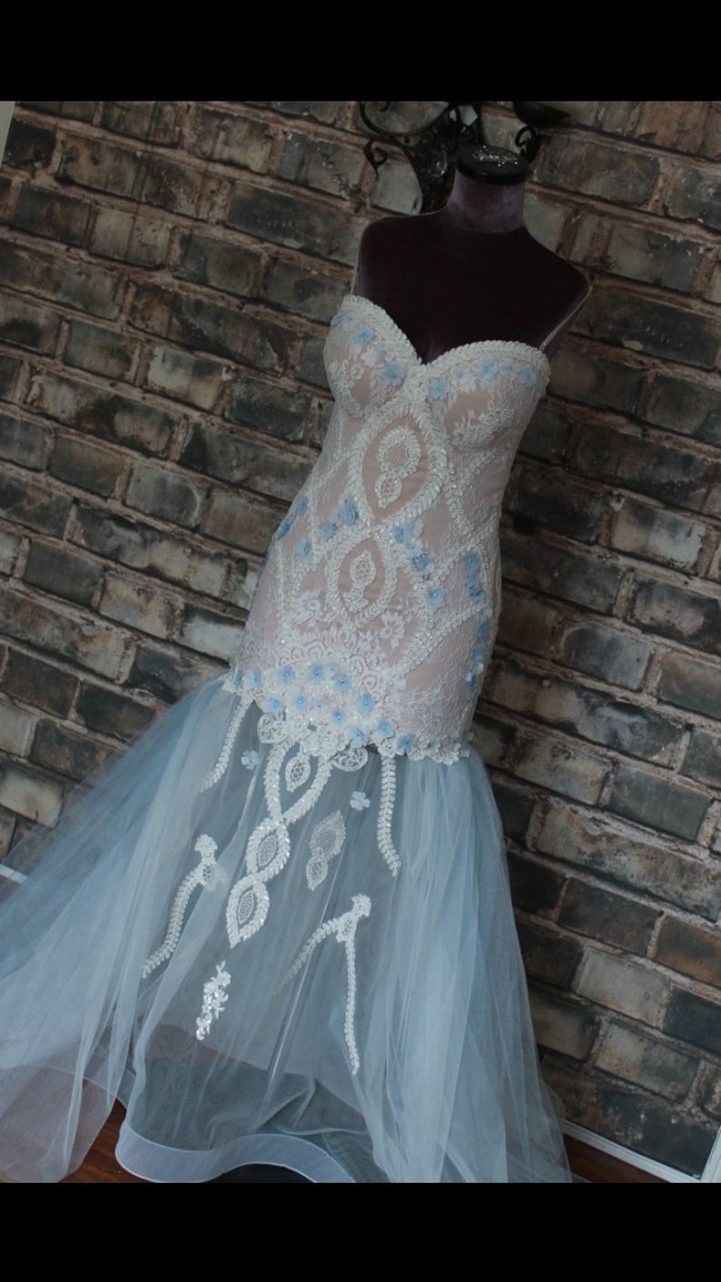 Blue White Mermaid Wedding Dress Nude Underneath Ivory Lace Wedding Dress Sexy Beach See Through Bottom Wedding Gown by etsy.com