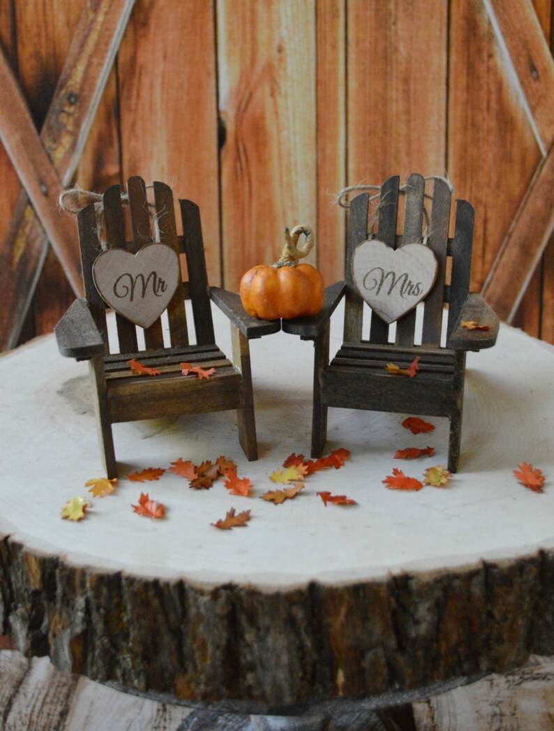 Fall Wedding Cake Topper Country Pumpkin Autumn Leaves Wood Chairs Adirondack Bride And Groom Groom S Cake Fall Wedding Decor Fall Leaves by etsy.com