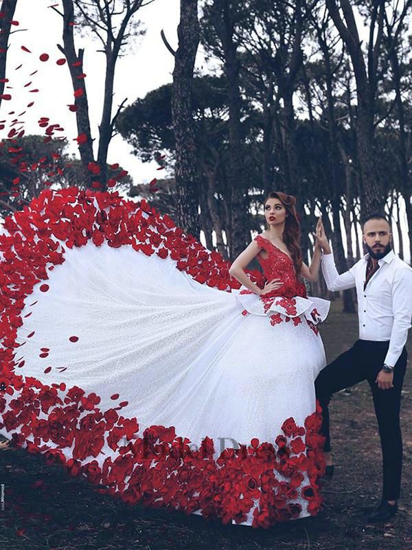 Red And White Wedding Dresses With 3d Handmade Flowers Peplum Sexy Deep V Neck Saudi Arab Women Dresses For Wedding Party Gowns by dhgate.com