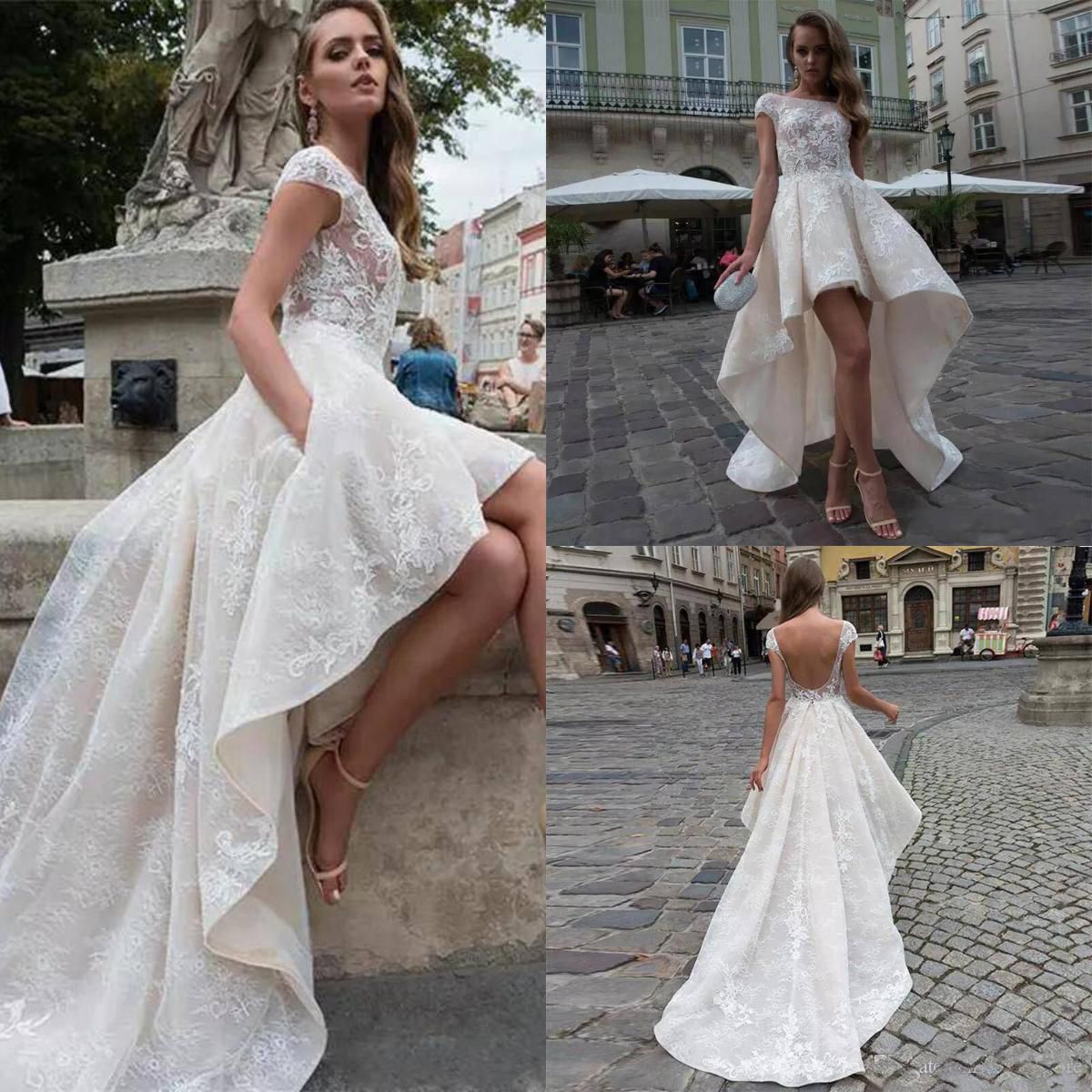 Designer Front Short Back Long Full Lace Summer Beach Wedding Dresses Scoop Cap Short Sleeve Country Sexy Backless Photograph Train Modest by dhgate.com