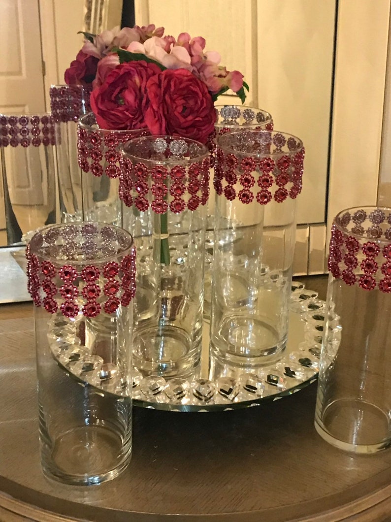 6 Sparkling Wedding Centerpieces Cylinder Vases With Sparkling Silver Flower Motif Wrap With Crystals Centerpieces Wedding Reception Decor by etsy.com