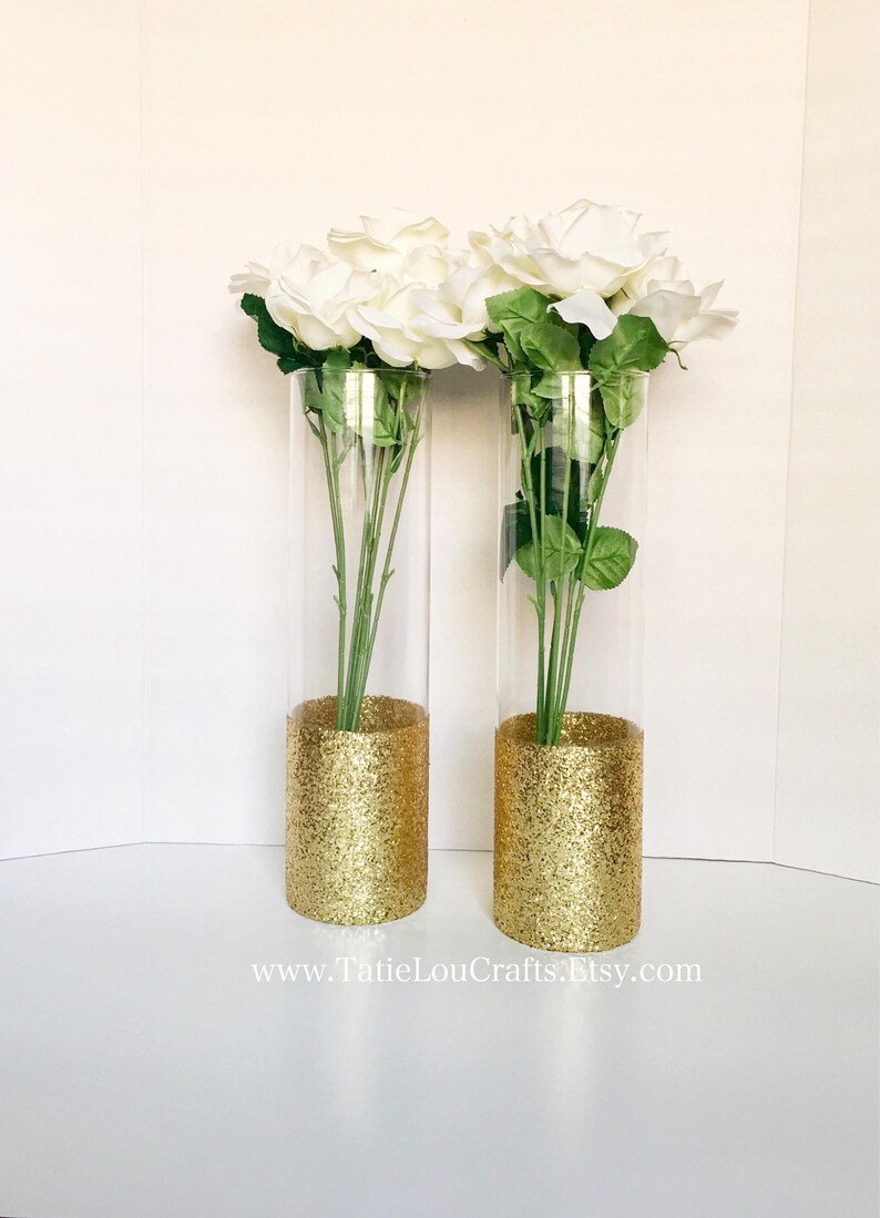 Set Of 2 15 Tall Vases Wedding Centerpiece Dipped Vases Glitter Vase Painted Vase Cylinder Glass Vase Gold Centerpieces Wedding Vases by etsy.com