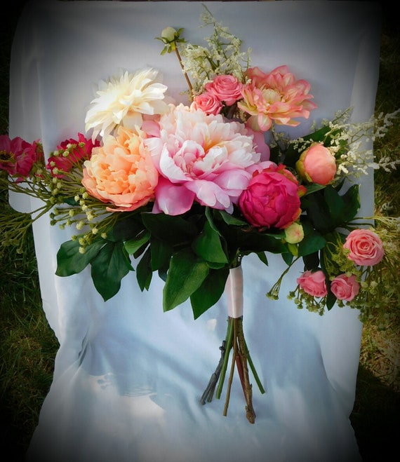 Coral Dahlia Bouquet Silk Bridal Bouquet Large Flower Bouquet Pink Peony Bouquet Garden Bouquet Wedding Bouquet Summer Wedding Flowers by etsy.com