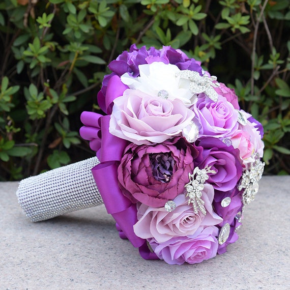 Bride Rose Bouquet Lavender Rose Peony Purple Theme Wedding Flowers With Crystal Rhinestone Jewelry Decoration by etsy.com
