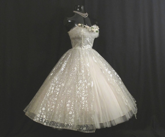 Vintage 1950 S 50s Strapless Bombshell White Silver Metallic Tulle Taffeta Lace Party Prom Wedding Dress Gown by etsy.com
