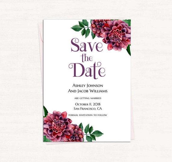 Burgundy Save The Date Template Dahlia Wedding Announcement Etsy